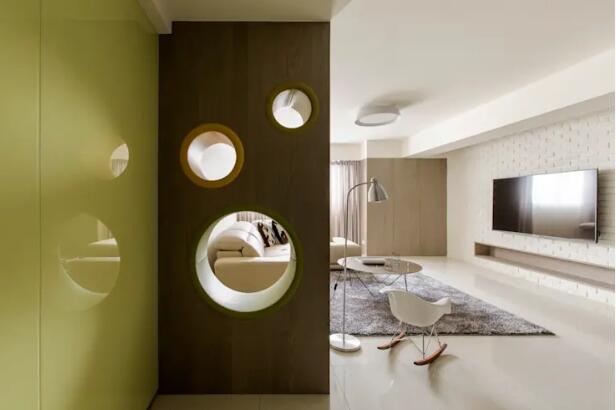 圖中的這個隔斷屏風挖了叁三個不同大小的圓,巧妙分隔空間的同時卻又有穿透感。