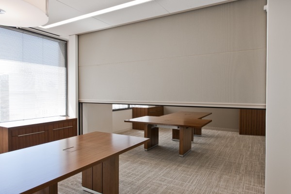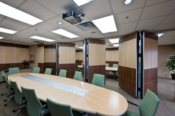 配對(duì)成可操作的壁式折疊面板的照片示例,該面板設(shè)計(jì)成會(huì)議室的隔斷